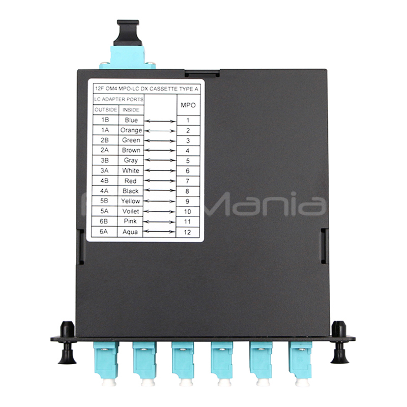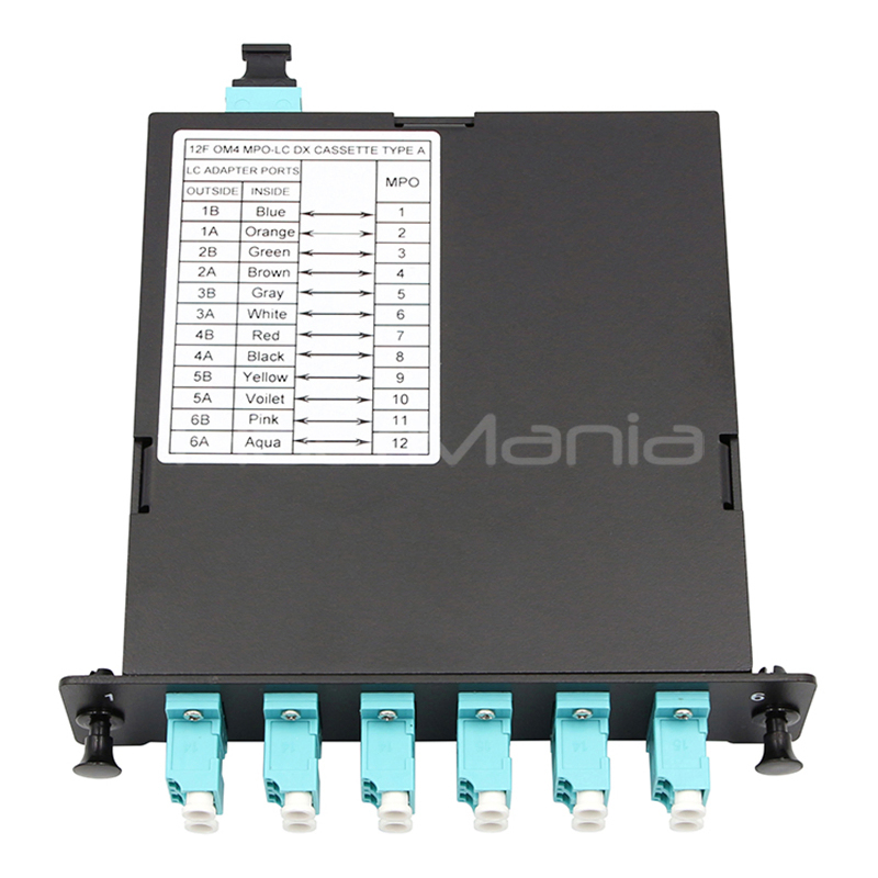 MPO/MTP cassette capable of accepting 6-24 fibers. These cassettes are suitable for use with Singlemode, Multimode 62.5 and 50um, as well as Laser Optimized, OM3 applications and are available in LC, SC, ST, FC, MTRJ connector types. MPO/MTP cassette comes pre-installed with the required adapters featuring Zirconia Ceramic sleeves for enhanced compatibility with all applications. Adapters are color-coded according to the application in use (Blue = 9/125; Beige = 62.5 and 50um; Aqua = OM3; Green = APC). All adapters come standard with dust covers.